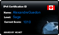 <a href="http://ipv6.he.net/certification/scoresheet.php?pass_name=AlexandreGuedon" target="_blank"><img src="http://ipv6.he.net/certification/create_badge.php?pass_name=AlexandreGuedon&amp;badge=3" style="border: 0; width: 229px; height: 137px" alt="IPv6"></img></a>