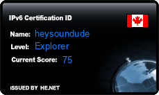 <img src="//ipv6.he.net/certification/create_badge.php?pass_name=heysoundude&amp;badge=3" style="border: 0; width: 229px; height: 137px" alt="IPv6 Certification Badge for heysoundude"></img>